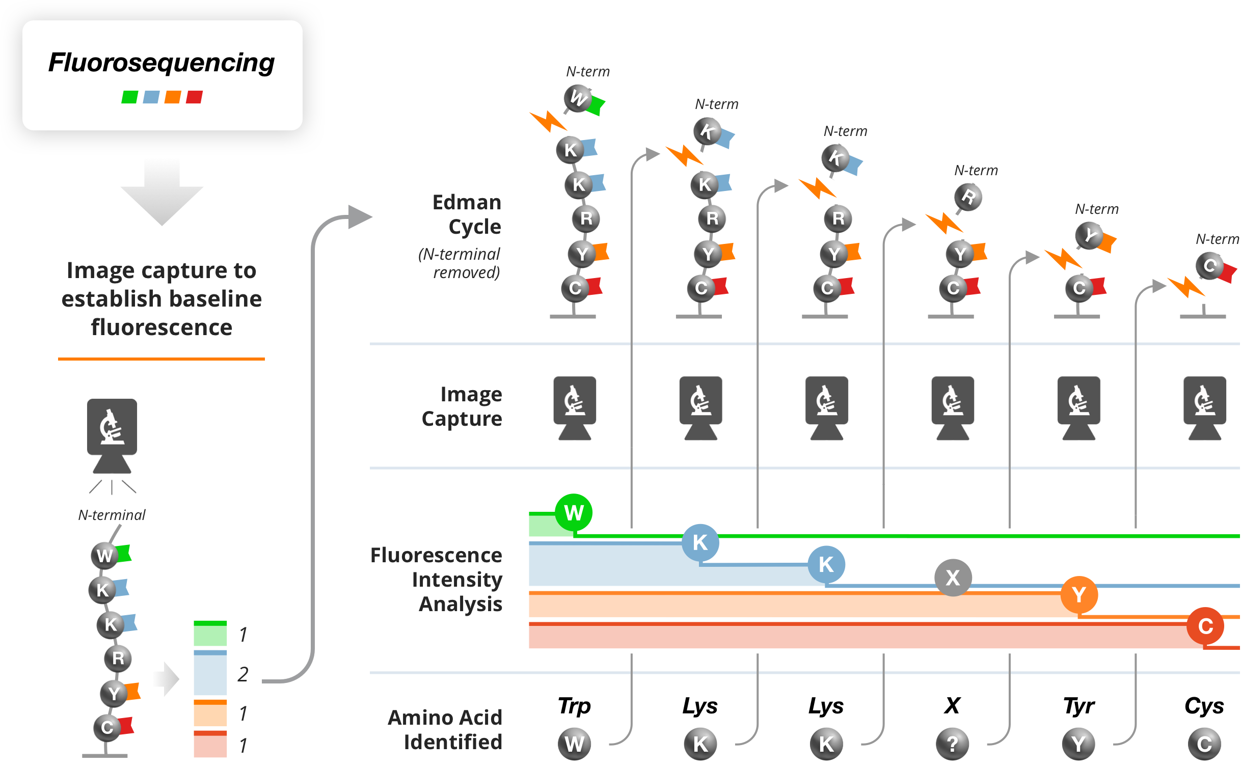 The key concept of Fluorosequencing as described in Nature Biotechnology article is as follows: First, one or more amino acid types on the peptides are selectively chemically labeled with specific identifier fluorophores. Millions of individual peptides are then immobilized on a glass cover slip. Next, each molecule’s fluorescence is monitored using total internal reflection fluorescence (TIRF) microscopy following consecutive rounds of amino-terminal (N-terminal) amino acid removal by Edman chemistry. The sequence positions of the labeled amino acids are thus identified for each peptide molecule, providing a partial sequence for each molecule. These fluorescence signatures (“fluorosequences”) can then be compared to a reference proteome for assignment to their proteins of origin.